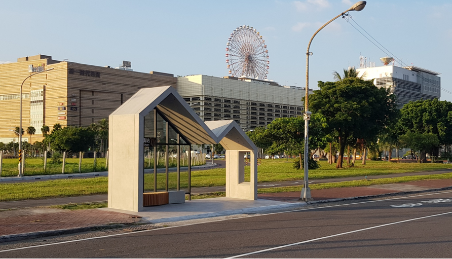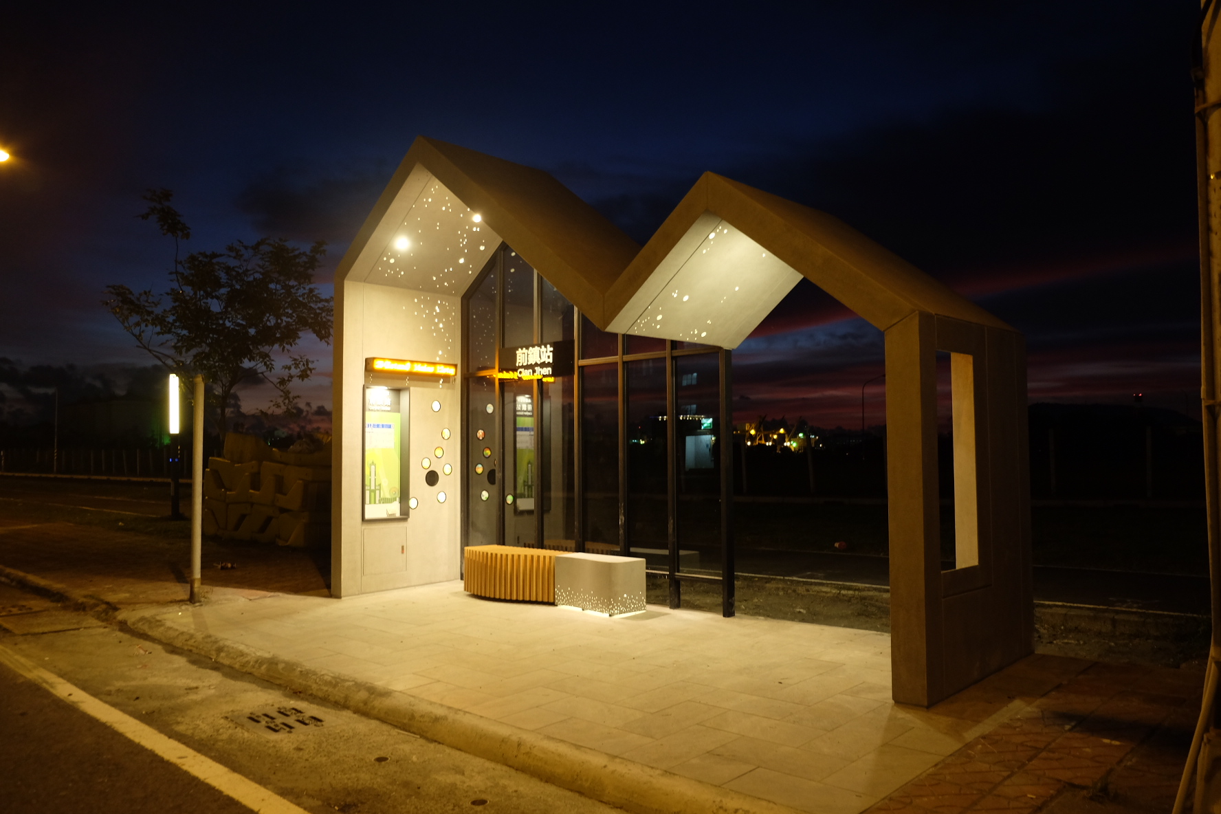 候車亭由再生鋼材、隔熱玻璃及綠建材地磚等環保建材構建而成,站體裝飾融入在地小學生的創作作品,讓候車空間轉變為人行道上的藝廊,提供民眾優質候車環境,也讓乘客等車時多了一份溫馨的氛圍。